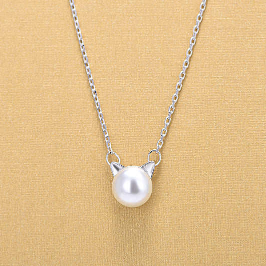 Sweet And Lovely Pearl Cat Ears Plated Platinum Short Necklace Temperament Kitten Clavicle Chain